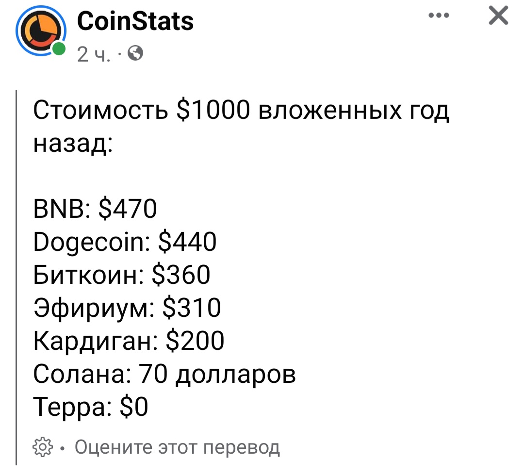 ну так міг би і не купляти биток, сидіти далі з доларом чи інвестувати його у інші проекти)sergej1974007 писав: ↑20 грудня 2022, 00:01"Заробив" би 2 х в бітку.
